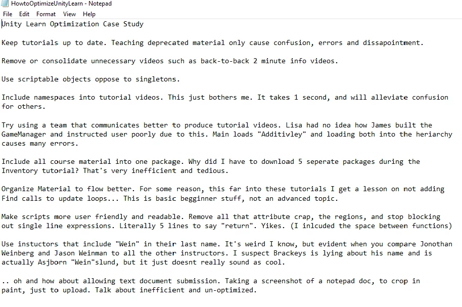 Once submission made me laugh, because it wasn’t about optimisation like Unity asked for, but instead, he gave a critique of Unity Learn.